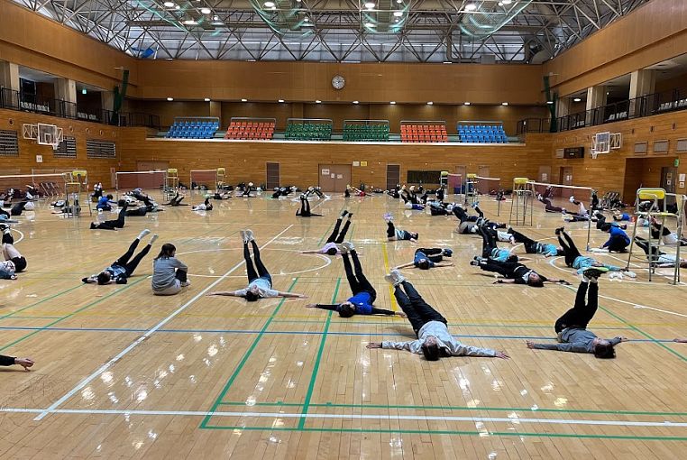 まず軽い準備体操の後、股関節の可動域を広げていくアクティブストレッチを教えて頂きます。昨年のものに新しい動作も加わり、動きながらのメニューも教わります。