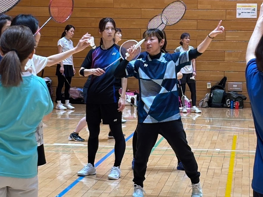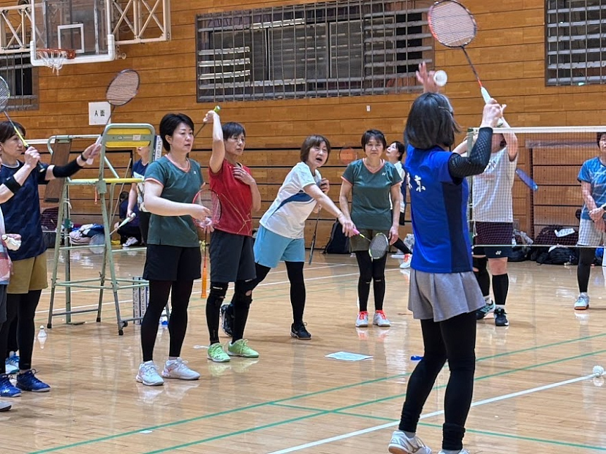 各コートに選手会の皆さんが1人ずつ入り、アドバイスを頂きながら進めていきます。クリアーも打てる体勢で打つことが大事です。